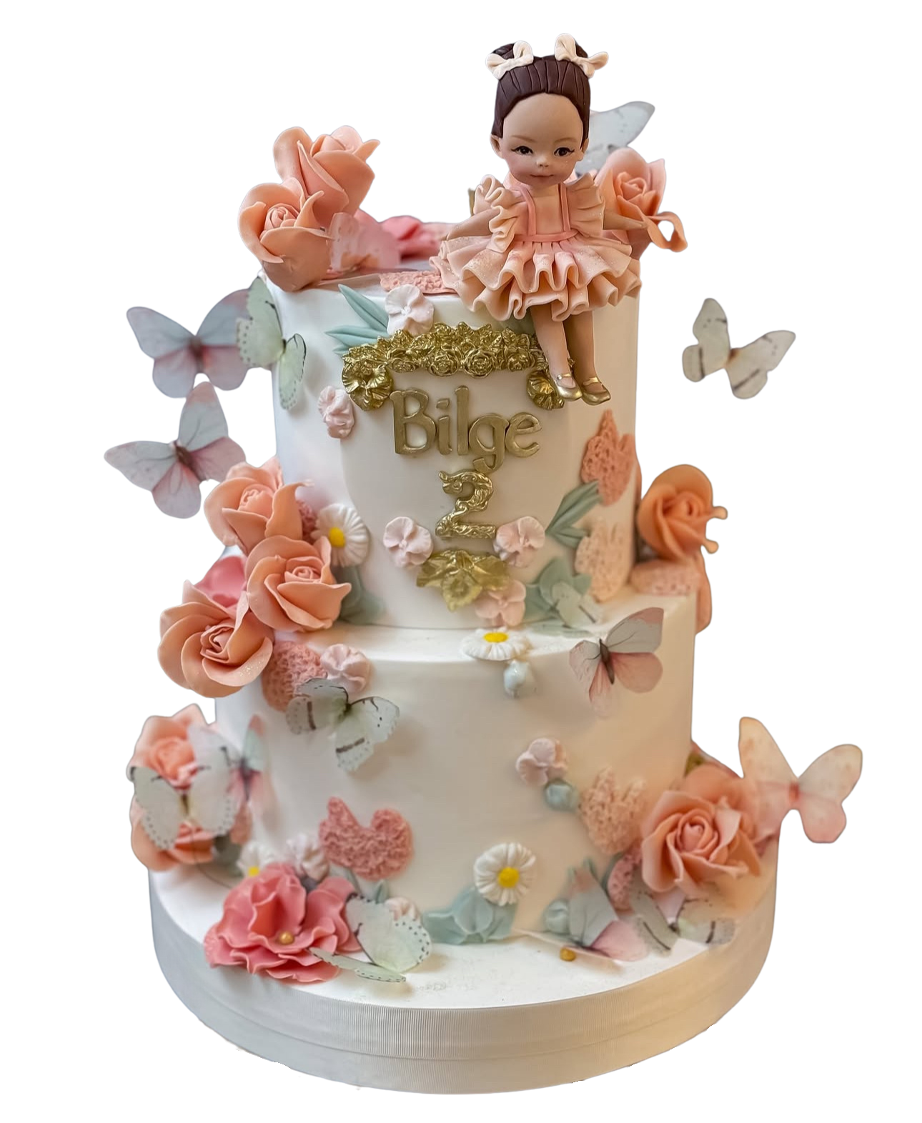 Pastel tonlarda çiçekler, zarif kelebekler ve el yapımı bebek figürüyle tasarlanan bu özel pasta, minik prenseslerin doğum günü kutlamalarına zarafet katıyor.