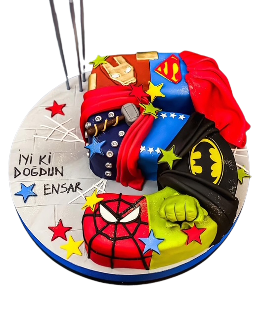 Kahraman dolu bir doğum günü için hazırlanmış bu Süper Kahraman temalı özel tasarım pasta, çocukların en sevdiği karakterleri tek bir pastada buluşturuyor! Spider-Man, Hulk, Batman, Captain America, Superman ve Iron Man detaylarıyla tasarlanan bu pasta; rengârenk figürleri, güçlü efektleri ve dinamik görünümüyle doğum günü masasının yıldızı olmaya aday.