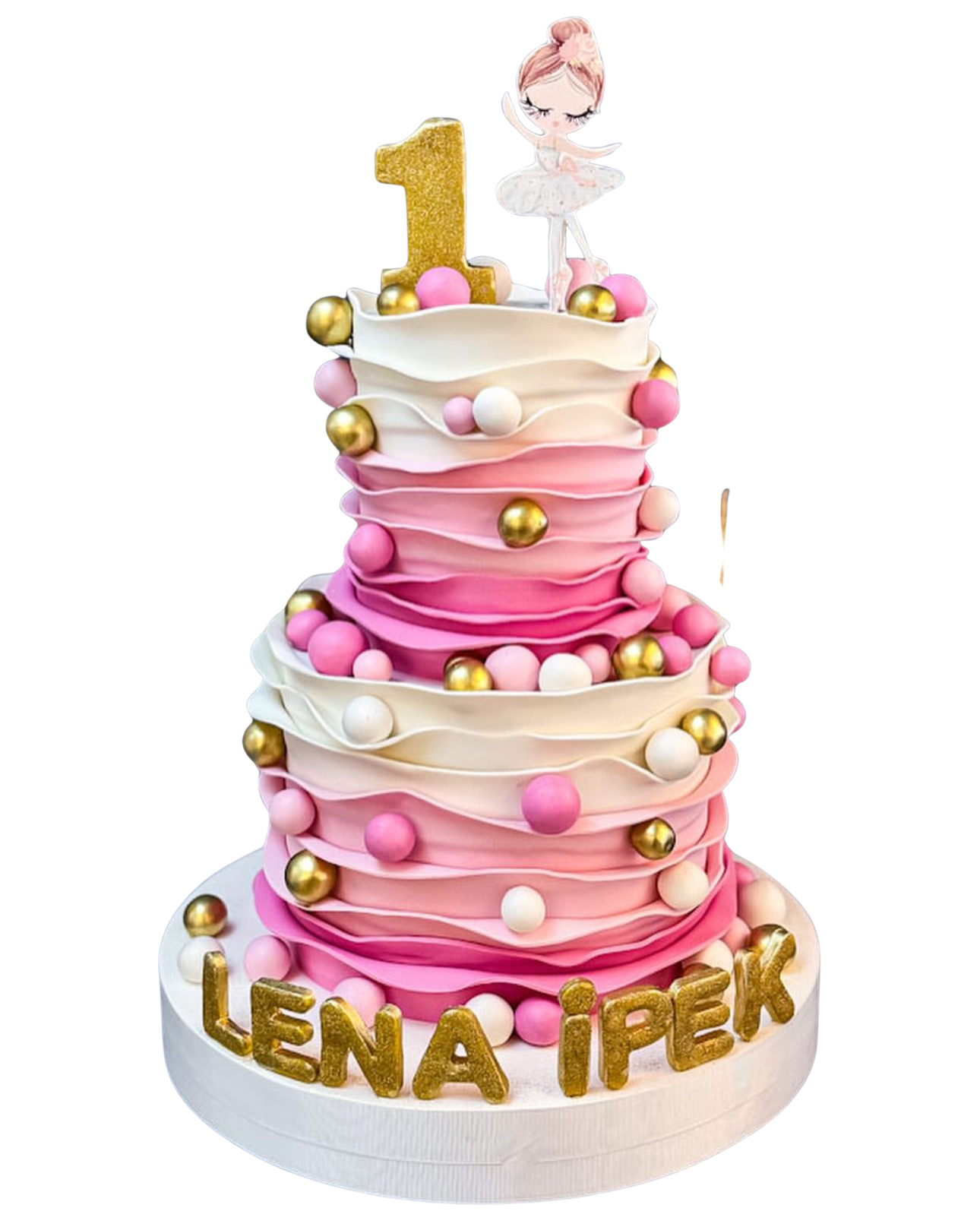 Pembe ve beyaz tonlarının zarif uyumuyla hazırlanan bu tasarım; kat kat şeker hamuru dalgaları, altın detaylar ve şirin balerin figürüyle masalsı bir görünüm sunar.