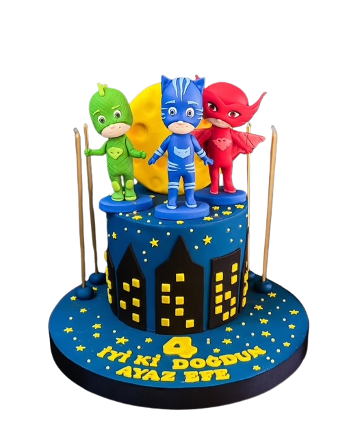 Pijamaskeliler çizgi filmini seven çocuklar için hazırlanan bu özel tasarım doğum günü pastası, gece şehri atmosferini rengârenk kahraman figürleriyle bir araya getiriyor. Canlı mavi zemin üzerine yıldız detayları, şehir silüetleri ve karakterlerin 3 boyutlu figürleriyle tamamlanan model; konsept parti düzenleri için son derece dikkat çekici bir görsel oluşturur.