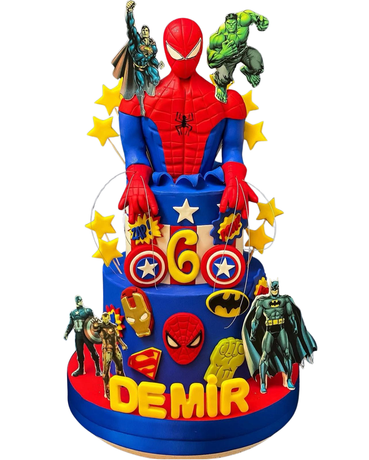 Yumuşacık pandispanya katları, lezzetli krema dolgusu ve el işçiliğiyle hazırlanmış süslemeleriyle hem göze hem damağa hitap eden bu pasta, süper kahraman temalı doğum günleri için harika bir seçim!