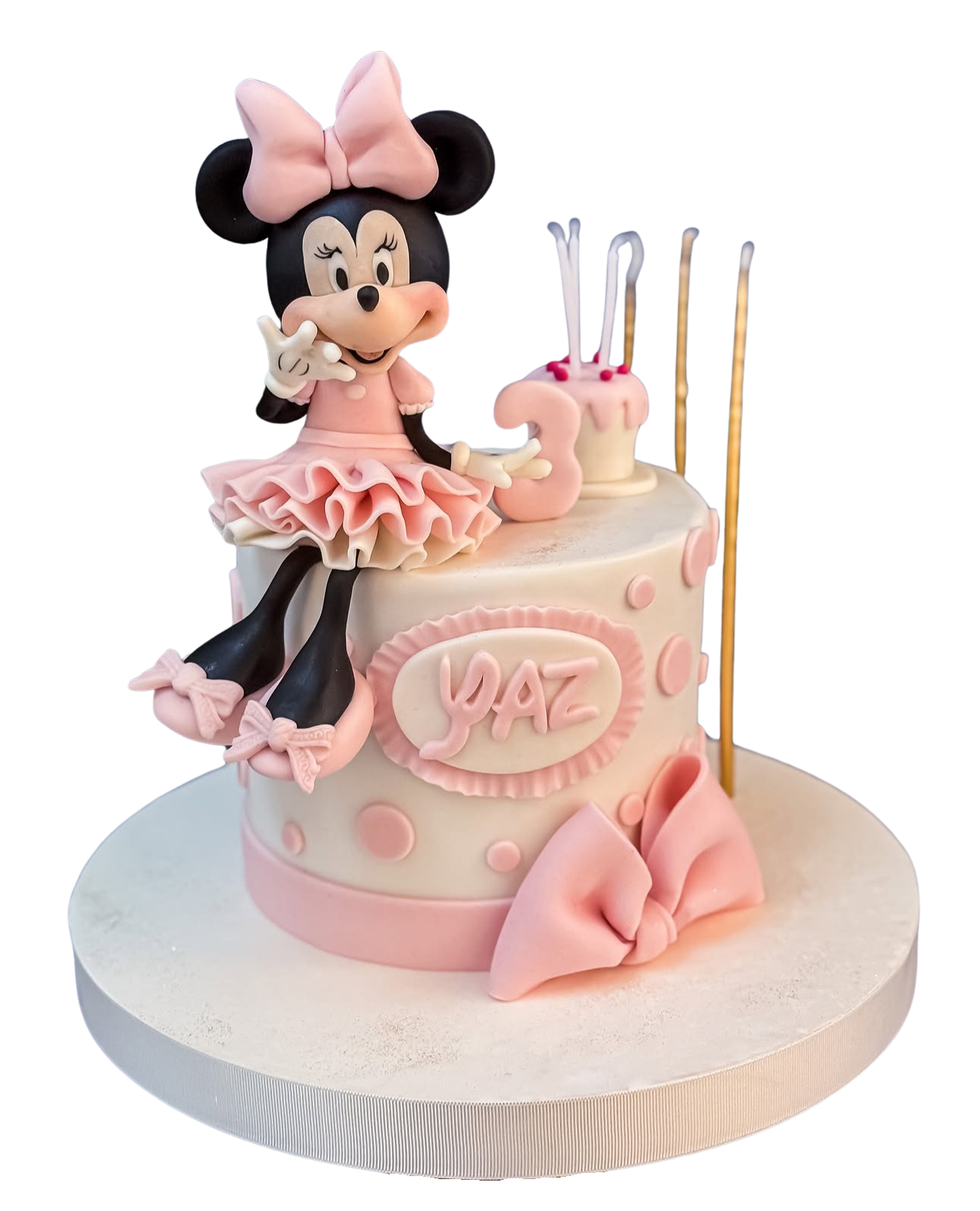 Bu özel tasarım Minnie Mouse Pembe Pasta, pastel pembe tonları, fiyonk detayları ve el yapımı Minnie figürüyle hem sevimli hem de zarif bir görünüm sunar.