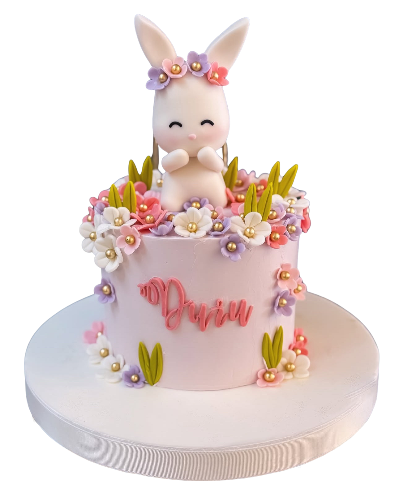 Pastel tonların yumuşaklığı ve sevimli detayların buluştuğu Tavşanlı Pasta, zarif çiçekleri ve tatlı tavşan figürüyle minik kutlamalara masalsı bir hava katıyor. 🌷