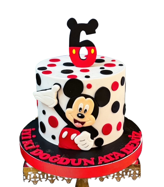 Mickey Mouse temalı bu özel tasarım doğum günü pastası, canlı renkleri ve eğlenceli detaylarıyla çocukların en çok sevdiği konseptlerden biridir. El yapımı Mickey Mouse figürü, kırmızı-siyah-beyaz renk uyumu ve dekoratif puantiye detaylarıyla kutlamalara neşe katar. Çocuk doğum günü partileri, konsept temalı kutlamalar ve özel günler için ideal bir tercihtir.