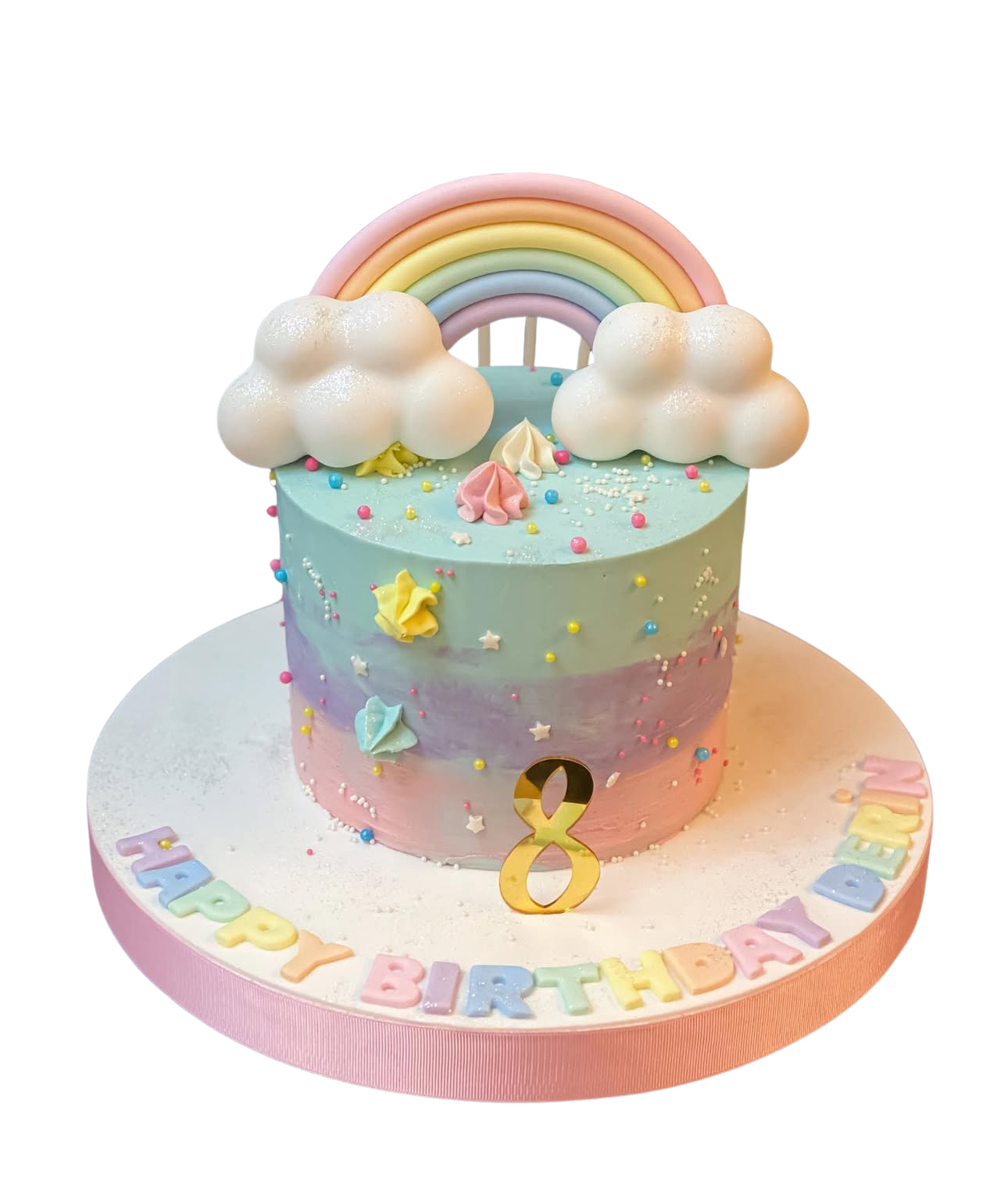 Pastel tonları, yumuşacık bulutları ve zarif gökkuşağı detayıyla bu pasta adeta bir mutluluk sembolü!