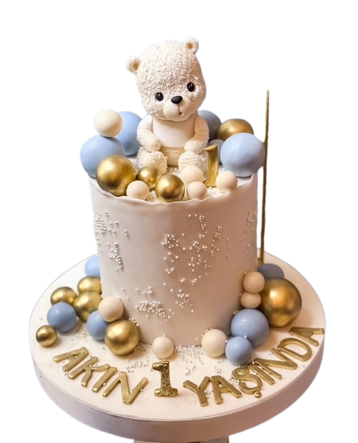 Miniklerin özel günlerine zarif ve sevimli bir dokunuş katan bu ayıcık temalı doğum günü pastası, yumuşak tonları ve modern tasarımıyla dikkat çeker. Üst kısmında yer alan detaylı modelleme ayıcık figürü, pastel mavi ve altın tonlarındaki dekor baloncuklarıyla birleşerek şık ve estetik bir görünüm sunar.