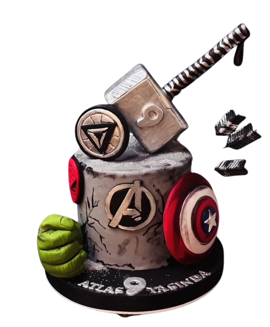 Avengers temalı partilerde, süper kahraman konseptli doğum günlerinde ve tematik kutlamalarda benzersiz bir merkez parçası olacak bu pasta, her yaş grubu için uyarlanabilir ve tamamen kişiye özel hazırlanabilir.