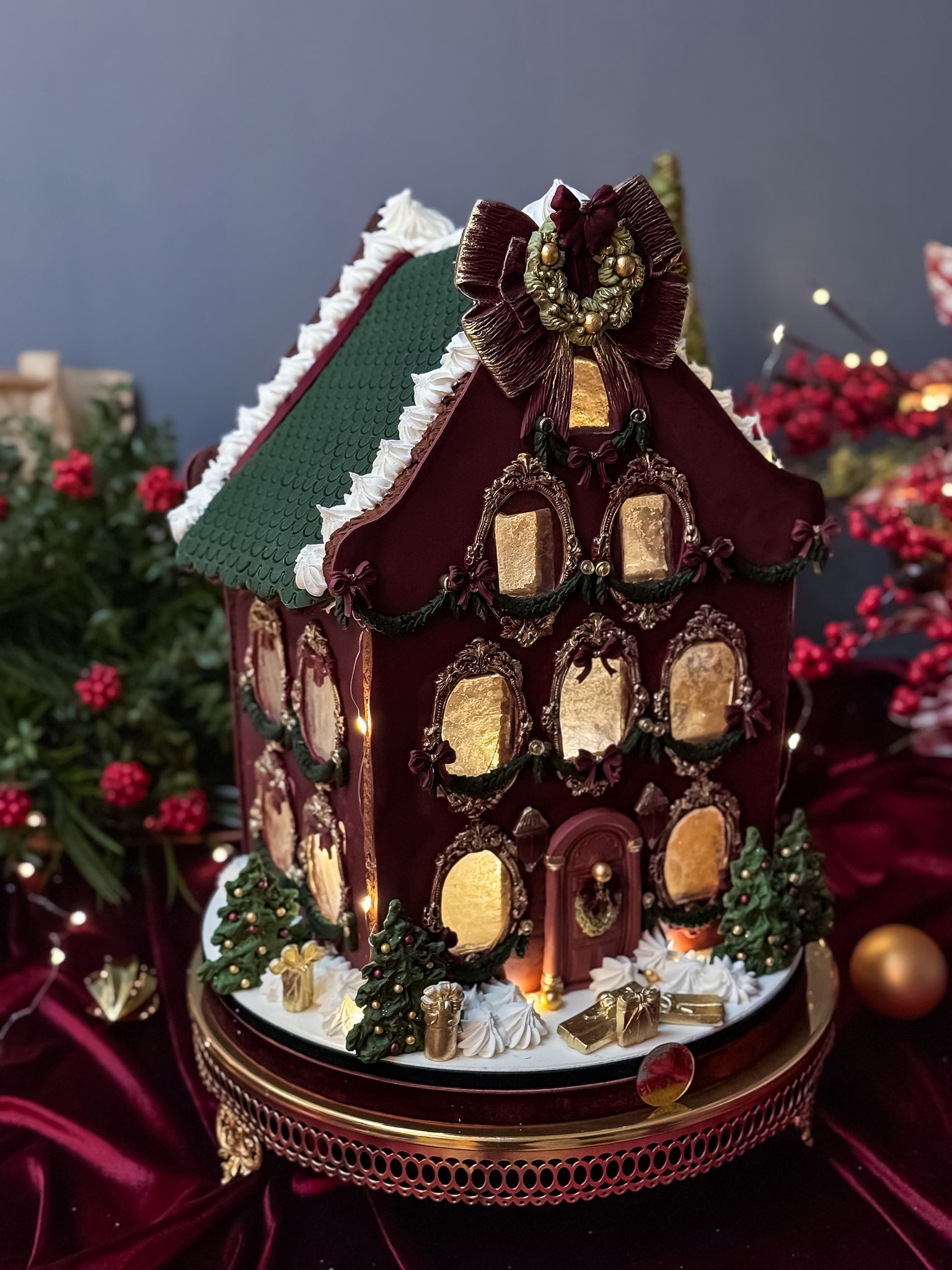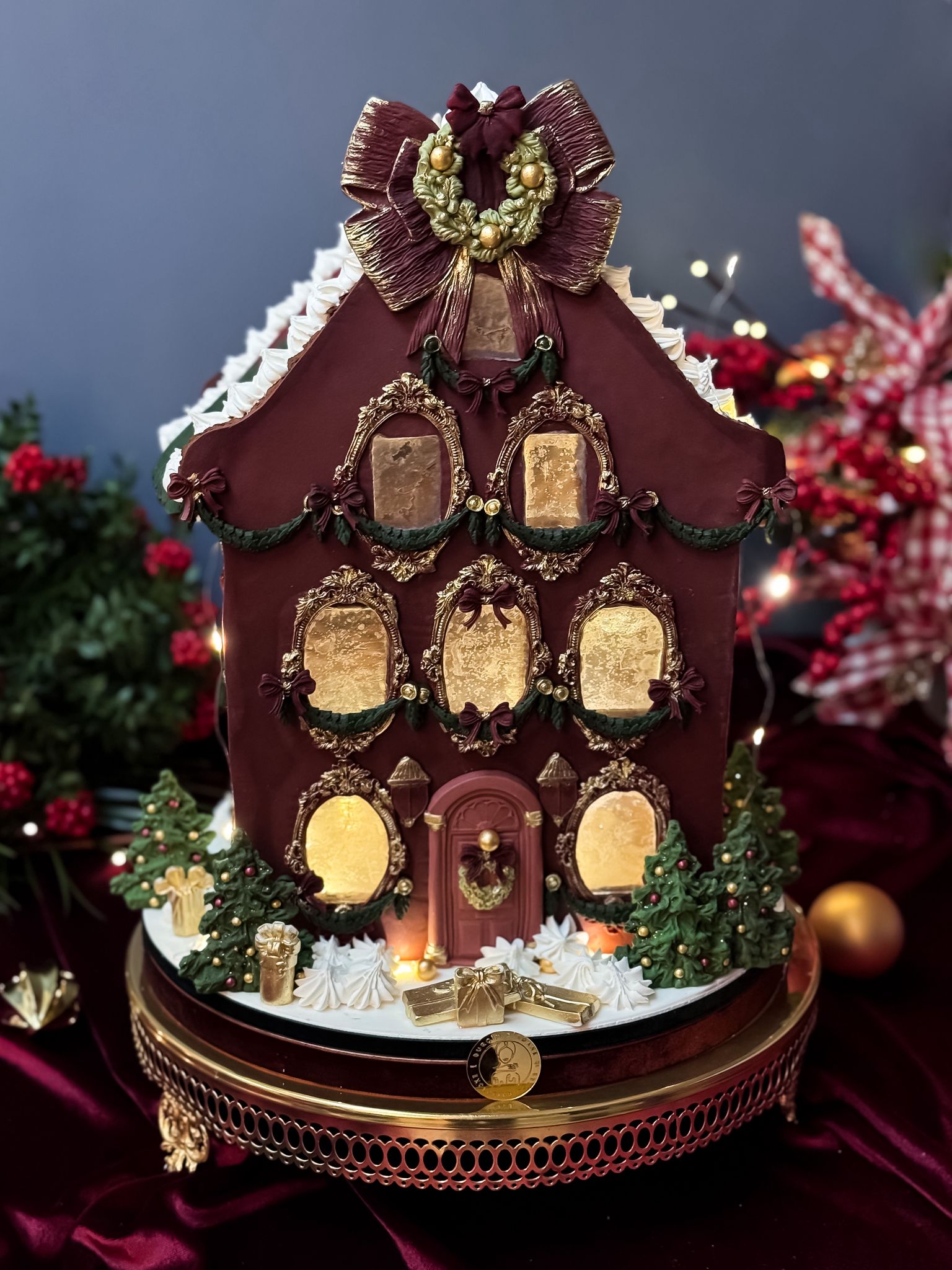 Kış ruhunu zarafetle buluşturan bu özel tasarım Kurabiye Ev, tamamen el işçiliği detaylarla hazırlanmış premium bir koleksiyon parçasıdır. Zengin bordo tonları, altın varak efektli pencereleri, kabartma çerçeveleri, özenle modellenmiş çam ağaçları ve ışık oyunlarını andıran dekorlarıyla yılbaşı atmosferini kusursuz şekilde yansıtır. Çatı detaylarından kapı süslerine kadar her bölümünde yüksek zanaatkârlık bulunan bu gösterişli tasarım, kutlama sofralarına büyüleyici bir dokunuş katar. Yeni yıl temalı özel çekimlerde, davetlerde ve butik kutlamalarda masanıza sanatsal bir şölen sunar.”