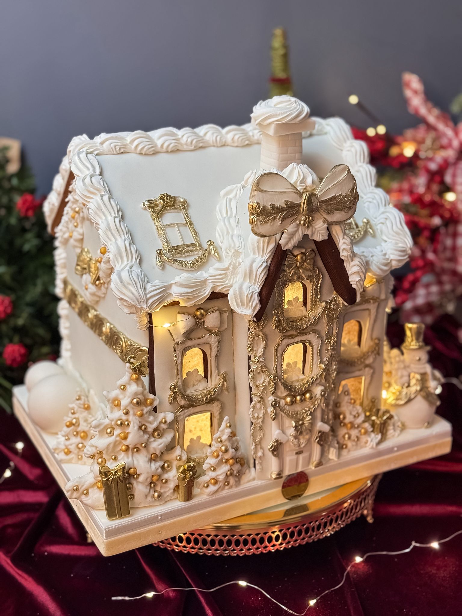 Yeni yıl ruhunu en zarif haliyle yansıtan bu gösterişli kurabiye ev, tamamen el işçiliğiyle hazırlanmış özel bir tasarımdır. Altın varak efektli pencereleri, kabartma dokulu süslemeleri, kardan adam figürü ve yılbaşı ağaçlarıyla; hem lezzet hem de estetik açısından koleksiyon niteliğinde bir ürün sunar.