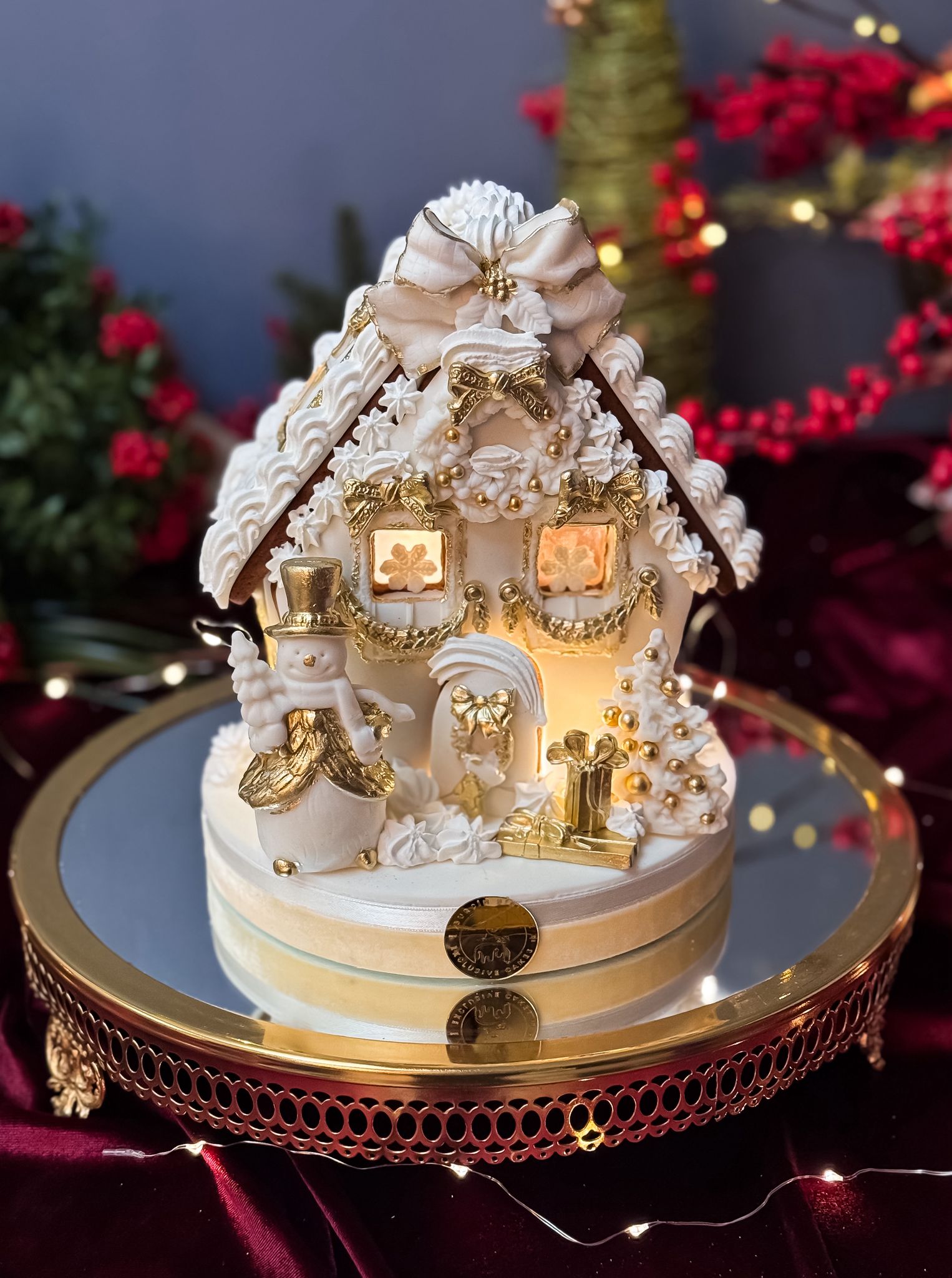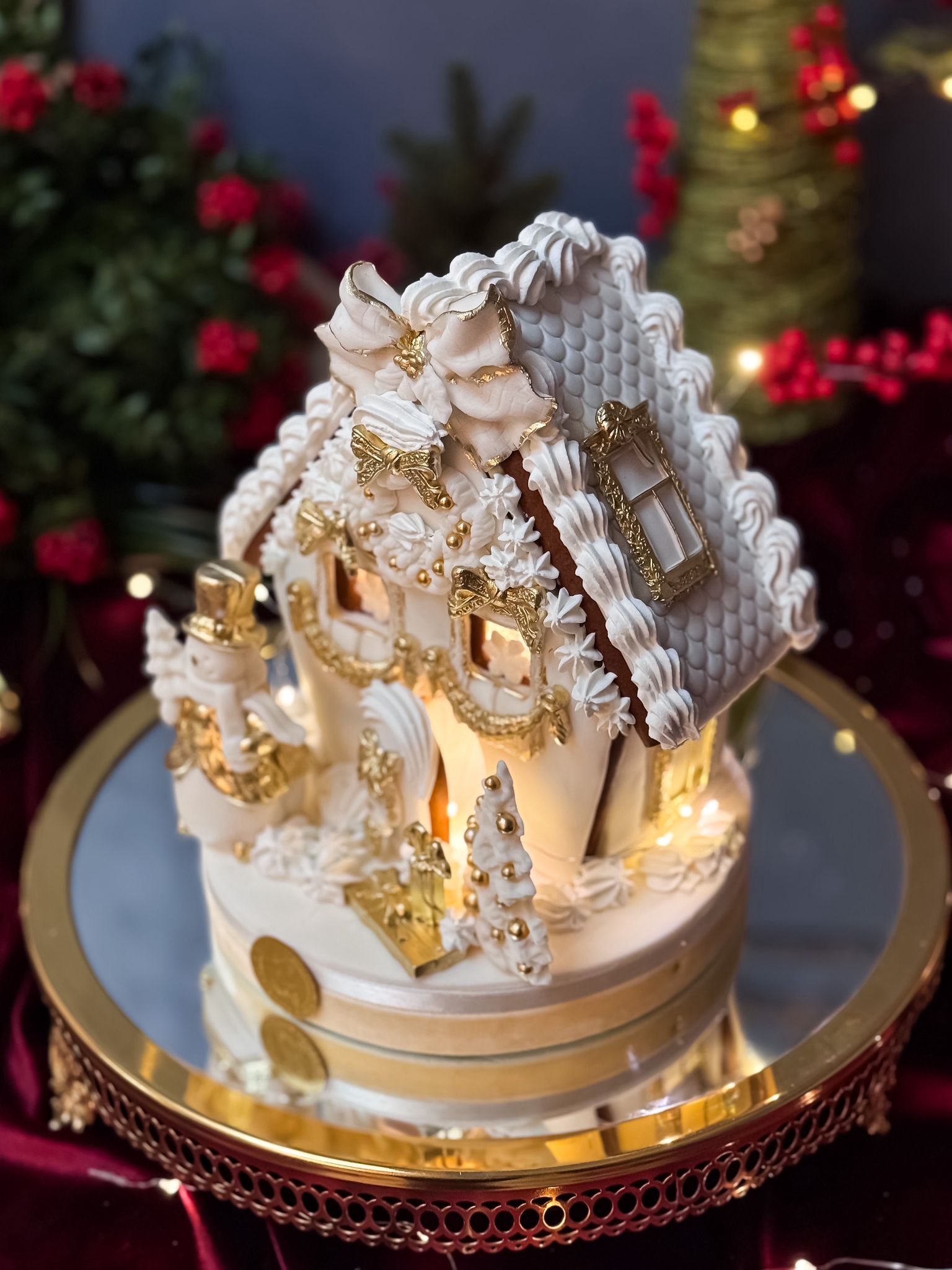 Yeni yıl ruhunu en zarif haliyle yansıtan bu özel tasarım kurabiye ev; altın dokunuşları, el işçiliği detayları ve ışıklandırılmış pencereleriyle yılbaşı masalarına büyülü bir atmosfer katıyor. Özenle çalışılmış çatı motifleri, kar efekti, altın süslemeler, minyatür yılbaşı ağacı ve sevimli kardan adam figürüyle hem görsel şölen hem de unutulmaz bir hediye alternatifi sunar.